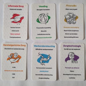 Illustratie & kaartontwerp voor een kwartspel voor in de zorg, ontwikkeld door anderen. Mijn bijdrage lag bij de visuele uitwerking van het spelmateriaal.